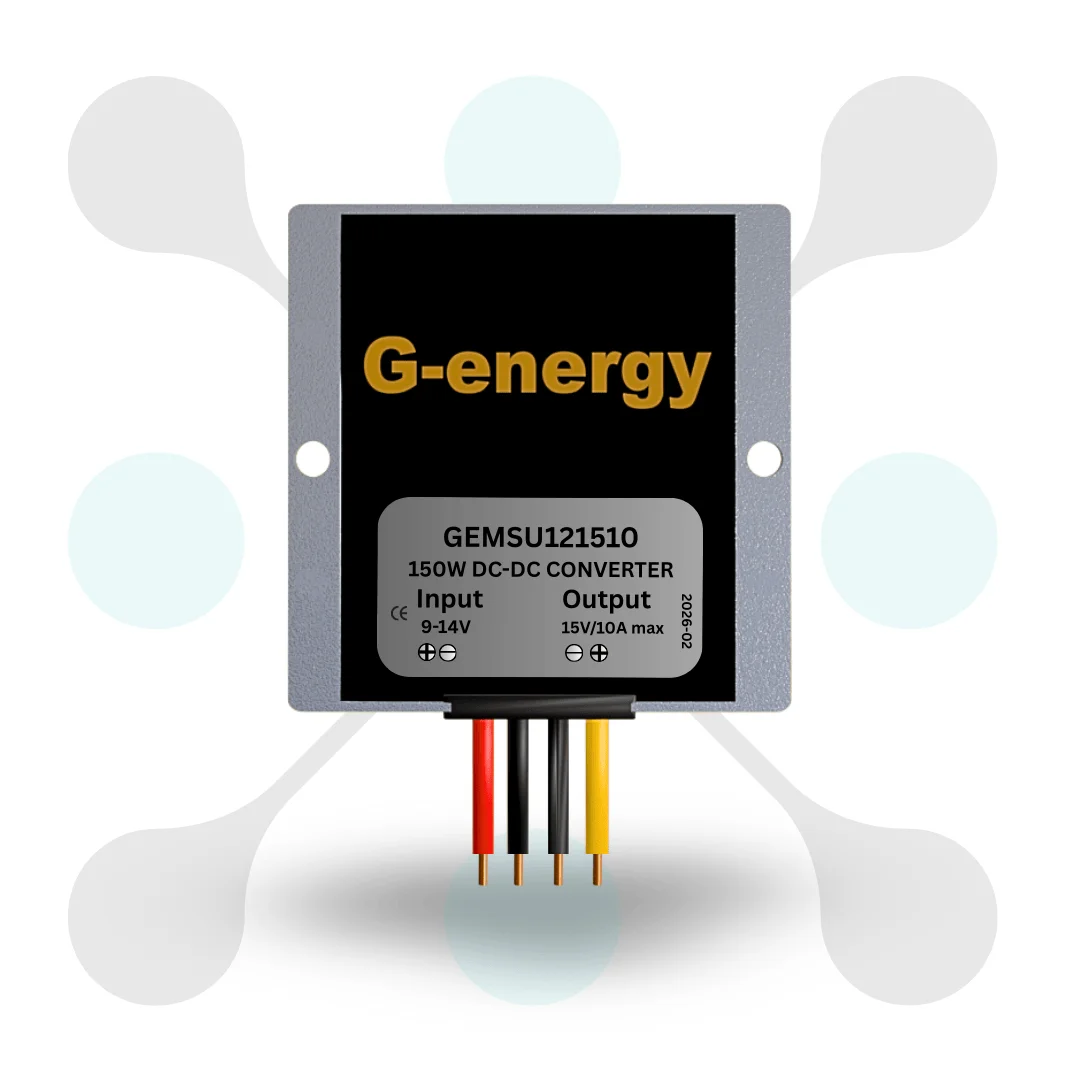 Introducing G-energy GEMSU121510 12V To 15V 10A 150W DC To DC converter IP68 converter. This 12V To 15V 10A 150W step up DC-DC converter efficiently boosts voltage maintaining stable power output with an IP68 waterproof rating. This converter provides stable 15V supply even when the input voltage fluctuates between 9V and 14V.